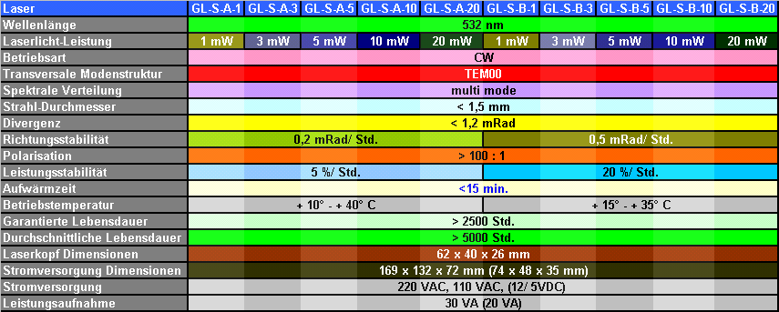 Dauerstrich DPSS Laser Systeme GL-S- Serie Spezifikationen