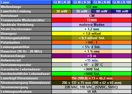 Dauerstrich DPSS Laser Systeme GLM-LN- Serie Spezifikationen