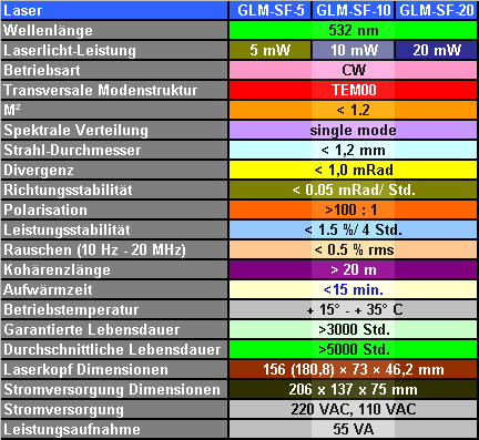 Dauerstrich DPSS Laser Systeme GLM-SF- Serie Spezifikationen