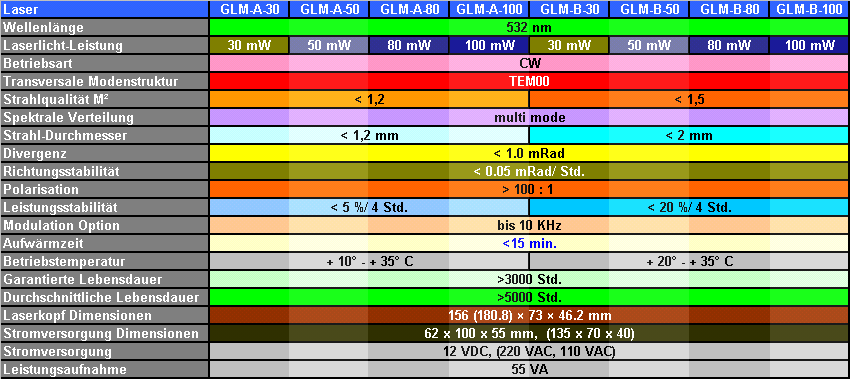Dauerstrich DPSS Laser Systeme GLM- Serie Spezifikationen