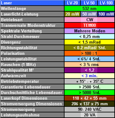 Dauerstrich DPSS Laser Systeme LV- Serie Spezifikationen