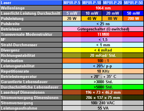 DPSS Laser Pulsbetrieb MPIR-P-Serie Spezifikationen