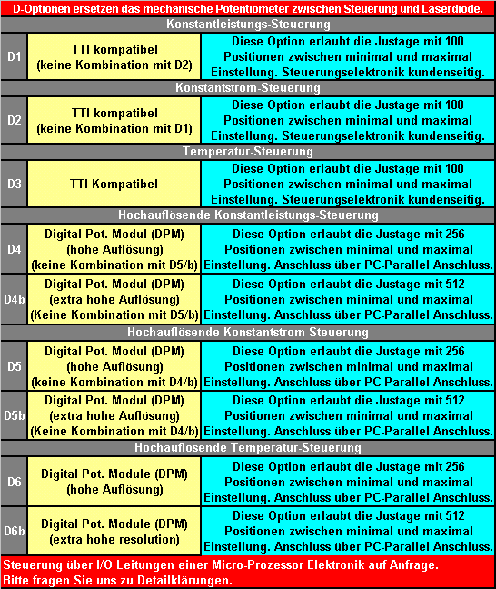 Diodenlaser Systeme D1 - D6 Optionen Spezifikationen
