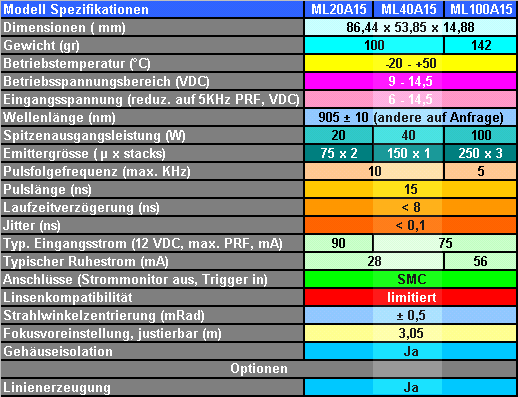 Dioden Laser Systeme Pulsbetrieb ML- Serie Spezifikationen