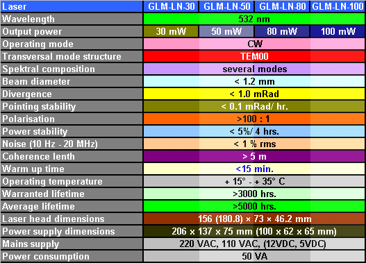 CW-DPSS Laser GLM-LN-Series Specifications