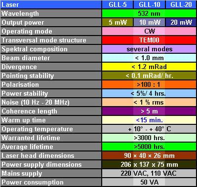 CW-DPSS Laser GLL-Series Specifications