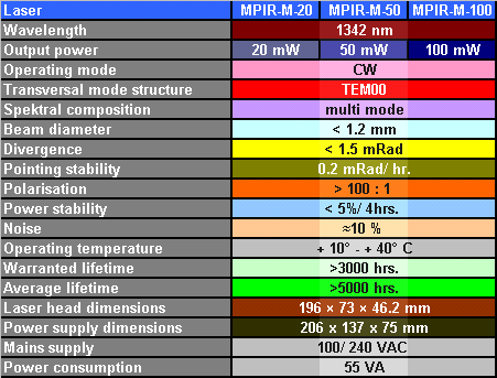 CW-DPSS Laser MPIR-M-Series Specifications