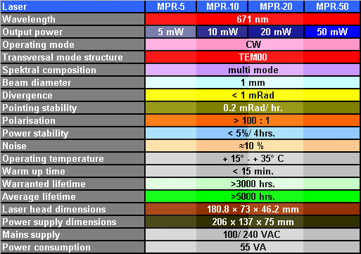 CW-DPSS Laser MPR-Series Specifications