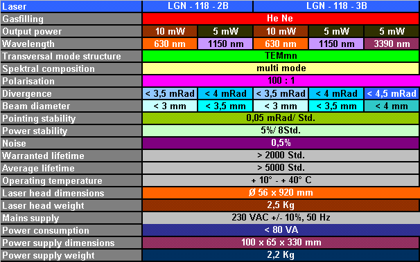 HeNe-Laser LGN-118 Multi-Wavelength Series Specifications